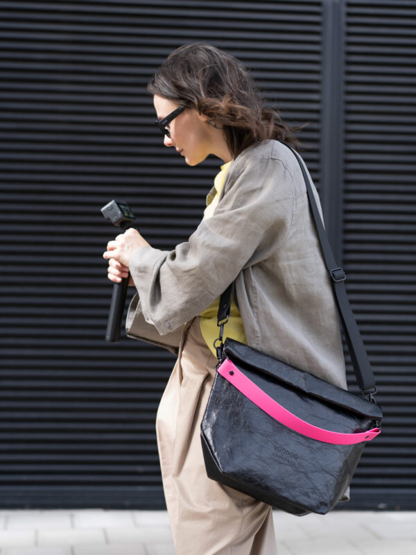It’s basically a transformer bag. Thanks to removable silicone straps in different colors and lengths it could be a clutch, a wallet, a crossbody or a shoulder bag. You may mix lengths and colors of straps and rich your own way to wear it.