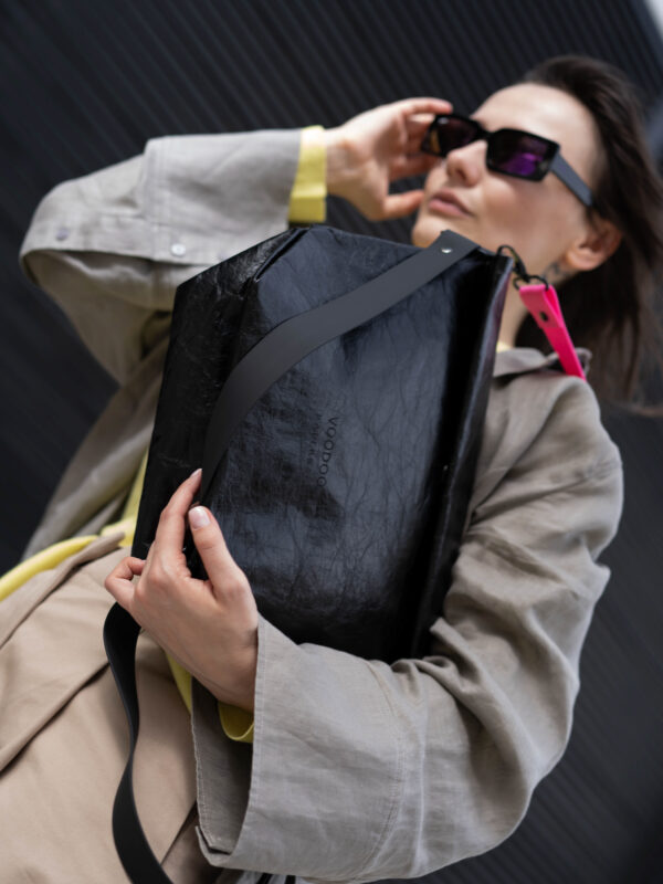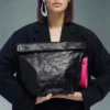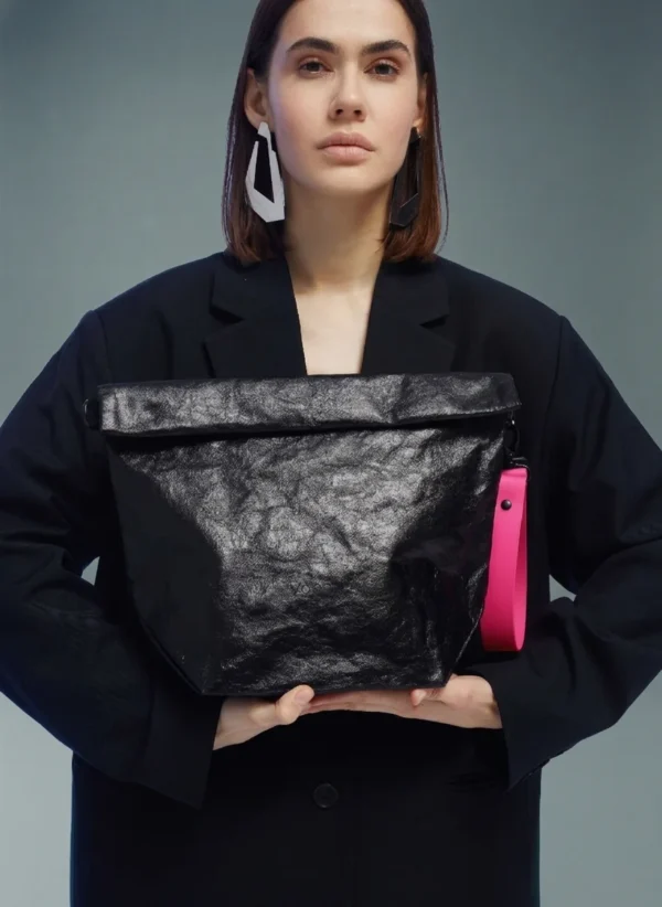 This clutch bag is made of WASHABLE PAPER, it is 100% vegan and sustainable new age material based on recycled cellulose.